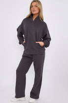 Elevate your athleisure wardrobe with the dark grey half zip tracksuit featuring straight leg joggers, a chic and functional ensemble designed for both comfort and style. The matching straight leg joggers offer a flattering and versatile fit. These joggers provide a smooth, streamlined silhouette. Ideal for those who appreciate a polished yet laid-back aesthetic, this tracksuit effortlessly transitions from the gym to the streets.